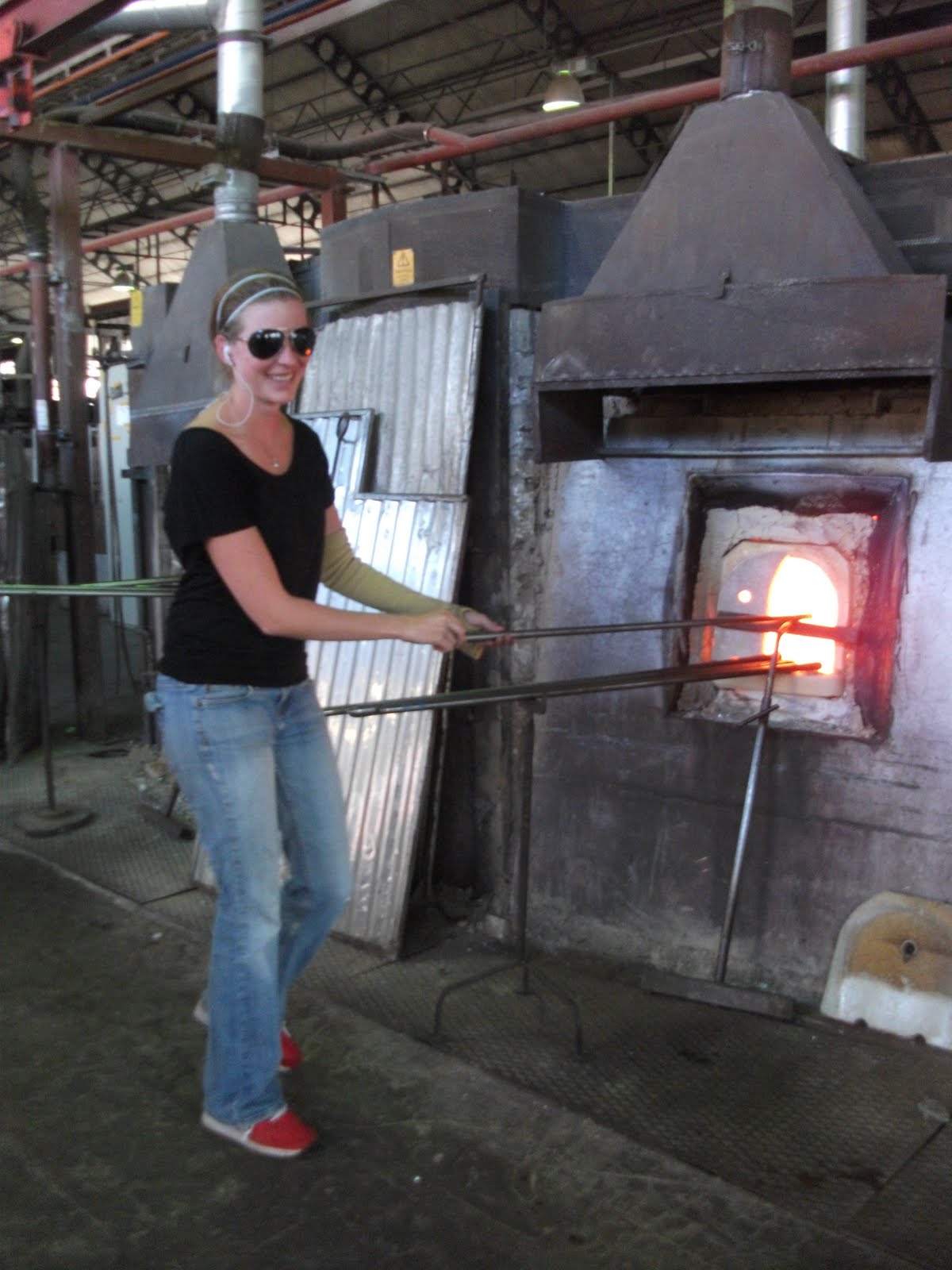 Today was a great day! I was exhausted and slightly stuffed up (in the nose) but things really went well in the hot shop. I made my first keep-able glass of the day before 10 AM (we start school around 9) and I made quite a few before lunch! I didn't hurt myself a single time and have gotten really good at knocking the excess glass off the blow pipe after I have made my tumbler. I also had a good afternoon, nothing too exciting, more the same but I got better at putting a proper bottom in the bottom of my tumblers instead of just a really thin one that could easily break. Also, in the afternoon I brought my Ipod to listen to music instead of the usual yellow ear plugs. It was really nice and made the time fly by - which is good and bad I think. It got kind of interesting when the most hectic part of the afternoon started, 11 people blowing glass from 2 furnace holes, the song Devil Went Down to Georgia (that is the weirdest video I have ever seen by the way!) came on and it made things seem like they were moving super fast and crazy... I had to step back and drink some water for a minute after that. I took a picture of one of the glasses I made yesterday for you guys: