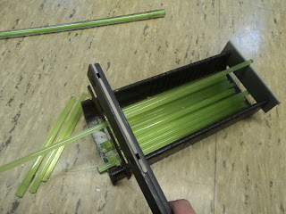 Then I cut them with this device. You put one end against the right part, and then hit it with a sharp knife on the left part which is also a sharp edge. This makes them all the same size and break pretty straight! Very nifty and a little therapeutic, getting to break some glass after my day...